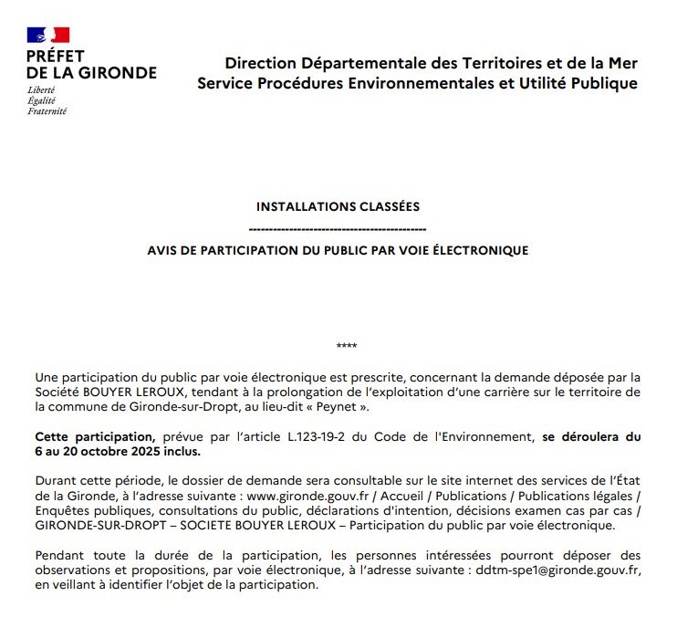 Une participation du public par voie électronique est prescrite, concernant la demande déposée par la Société BOUYER LEROUX, tendant à la prolongation de l’exploitation d’une carrière sur le territoire de la commune de Gironde-sur-Dropt, au lieu-dit « Peynet ». Cette participation, prévue par l’article L.123-19-2 du Code de l'Environnement, se déroulera du 6 au 20 octobre 2025 inclus. Durant cette période, le dossier de demande sera consultable sur le site internet des services de l’État de la Gironde, à l’adresse suivante : www.gironde.gouv.fr / Accueil / Publications / Publications légales / Enquêtes publiques, consultations du public, déclarations d'intention, décisions examen cas par cas / GIRONDE-SUR-DROPT – SOCIETE BOUYER LEROUX – Participation du public par voie électronique. Pendant toute la durée de la participation, les personnes intéressées pourront déposer des observations et propositions, par voie électronique, à l’adresse suivante : ddtm-spe1@gironde.gouv.fr, en veillant à identifier l’objet de la participation.