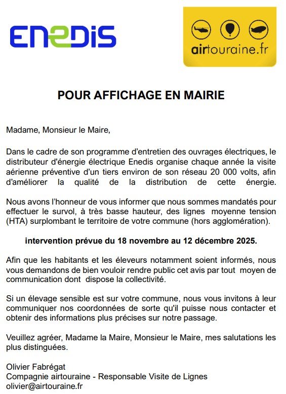 Dans le cadre de son programme d’entretien des ouvrages électriques, le distributeur d'énergie électrique Enedis organise chaque année la visite aérienne préventive d’un tiers environ de son réseau 20 000 volts, afin d’améliorer la qualité de la distribution de cette énergie. Des survols de lignes, à très basse hauteur, des lignes moyenne tension (HTA) surplombant le territoire de la commune auront lieu du 18 novembre au 12 décembre 2025.
