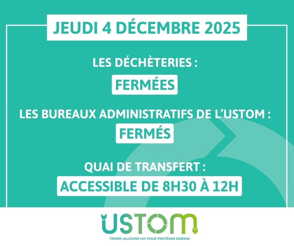 À l’occasion de la réunion de fin d’année du personnel rassemblant l’ensemble des équipes de l’USTOM, les six déchèteries du territoire ainsi que le siège administratif seront exceptionnellement fermés.